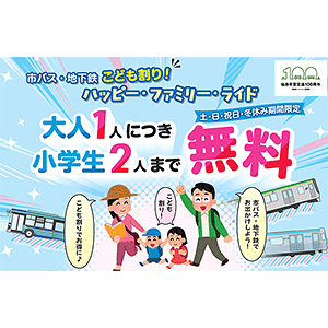 期間限定で、大人(中学生以上)1人につき小学生2人まで市バス・地下鉄の運賃が無料!家族でのお出かけに、ぜひ市バス・地下鉄をご利用ください!